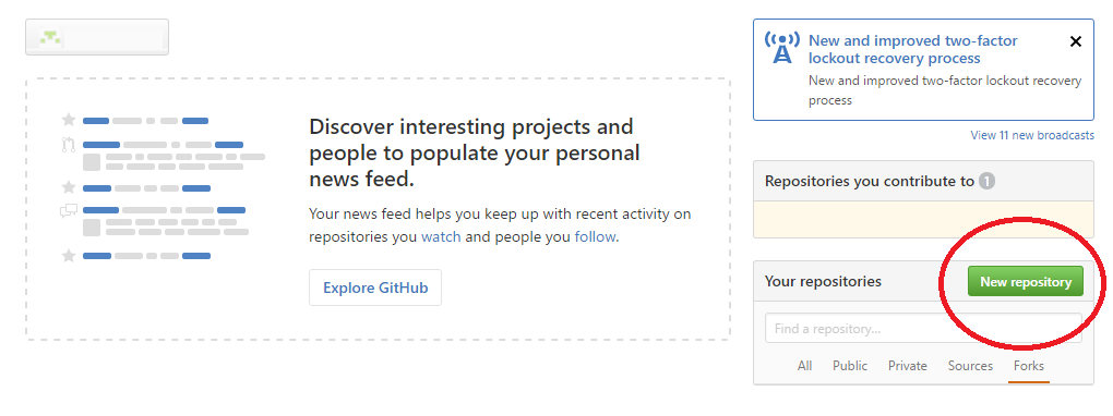 Let’s say we want to create a small library of math functions in C++ and we want to manage this project with Git. We also want to share this library with the world so we will host the repository on GitHub. To do this, let’s first create a new repository on GitHub. Navigate to GitHub and sign into your account. On the homepage, there is a button that says “New Repository.” Click this button.